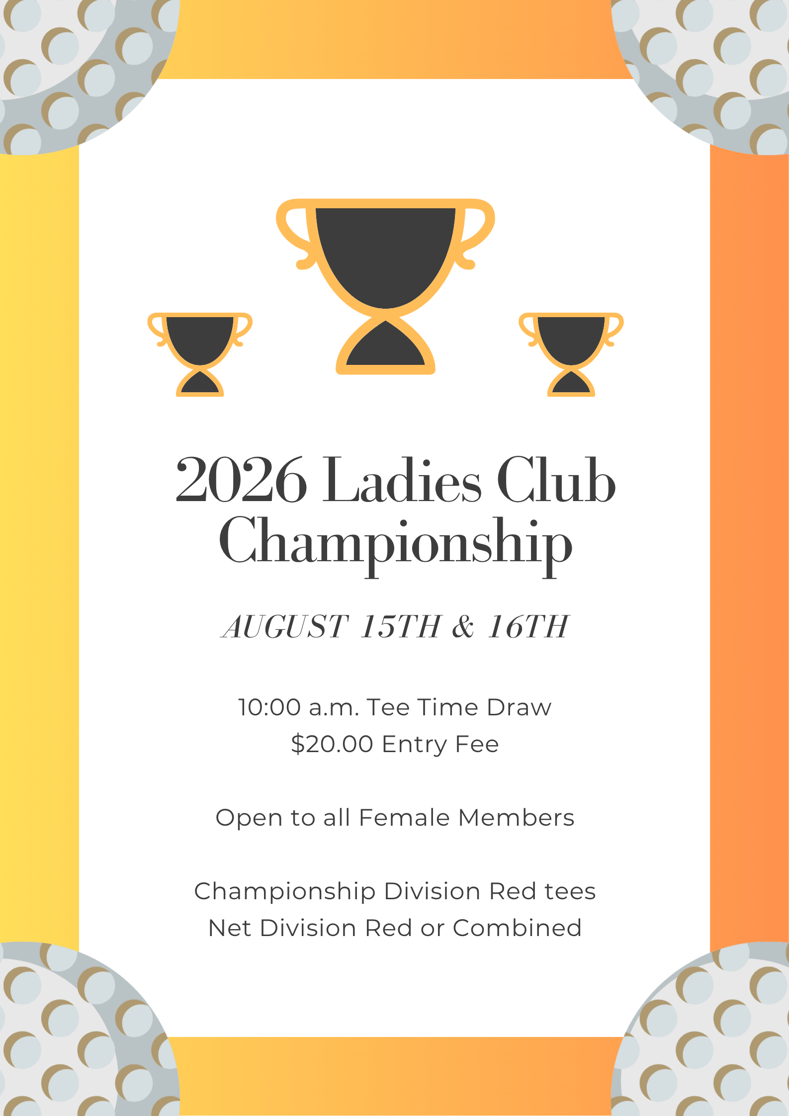 Ladies Club Championship Sunday, August 16, 2026 10:00 a.m. 11:00 a.m. Google Calendar ICS Link Here to Enter the Ladies Club Championship Link Here to Enter the Ladies Club Championship