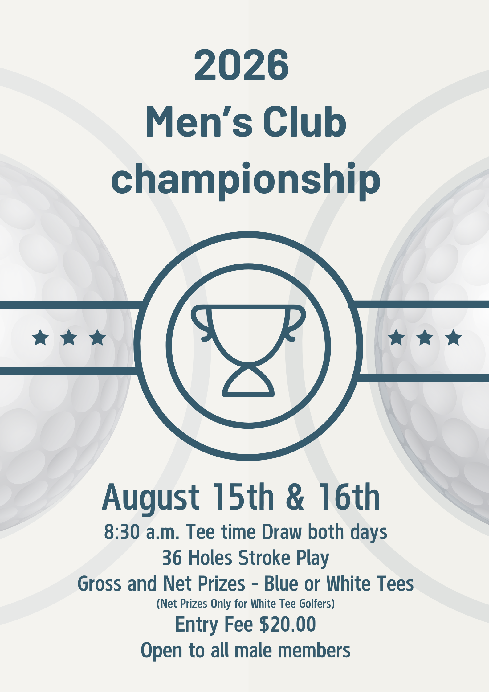 Men's Club Championship Sunday, August 16, 2026 8:00 a.m. 9:00 a.m. Google Calendar ICS Link Here to Enter the Men's Club Championship Link Here to Enter the Men's Club Championship
